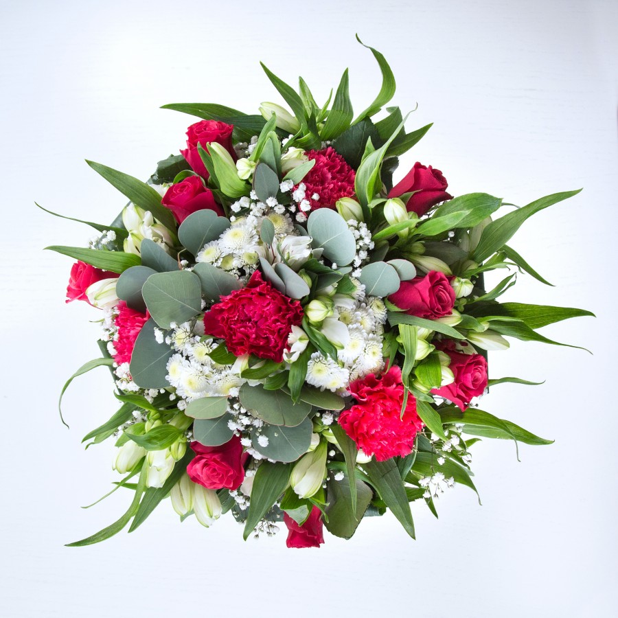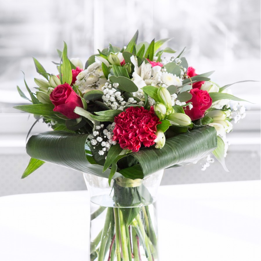 Step into a world of charm and distinction with our magnificent bouquet. This exquisite arrangement features pure white chrysanthemums, airy gypsophila, passionate red roses, and delightful carnations, paired with pristine white alstroemeria and lush aspidistra leaves. Every bloom is selected to create a striking and luxurious display.