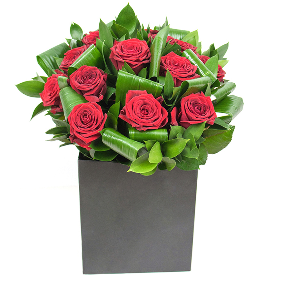 Illuminate your space with our radiant red rose bouquet, a perfect fusion of beauty and uniqueness. This stunning arrangement combines vibrant red roses, lush aspidistra leaves, and elegant ruscus, creating a visually striking display.